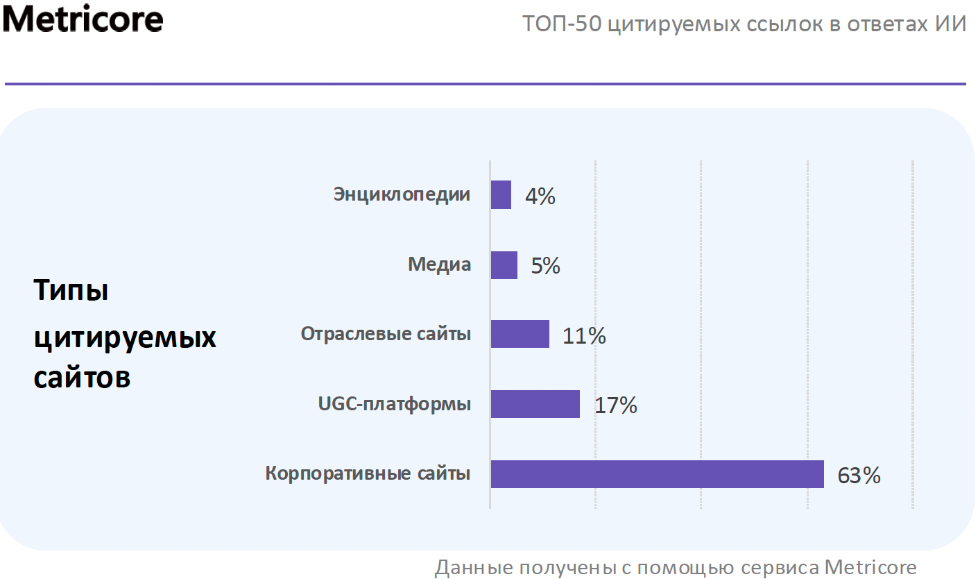 В рамках исследования мы, команда Metricore, проанализировали 150 000 цитирований ссылок в ответах ИИ (ChatGPT, YandexGPT, Google AI Overviews, Perplexity и др.).Далее мы: