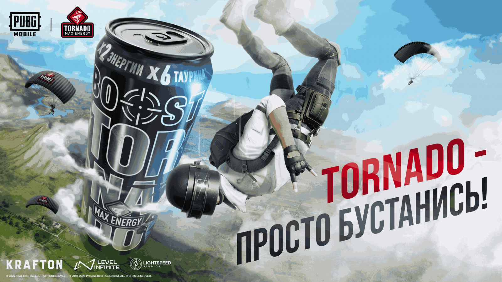 В рамках масштабной коллаборации TORNADO ENERGY и PUBG Mobile представили необычную новинку — новый вкус энергетика TORNADO BOOST, который можно не только попробовать в реальной жизни, но и использовать в игре для усиления персонажа. В инвентаре игроков вместо привычного энергетика теперь появится виртуальный TORNADO BOOST.