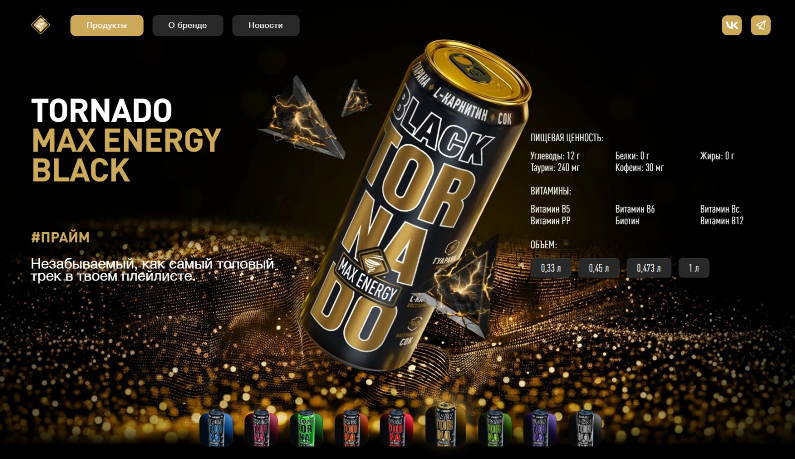 Визуальная часть — отдельный акцент редизайна, который вдохновлен эстетикой гейминга и футуристическими мотивами: тёмная палитра, контрастные элементы, выраженная типографика и движение в интерфейсе поддерживают общее ощущение динамики и технологичности. Отдельно подчеркнуты визуальные решения, перекликающиеся с обновлённой черной упаковкой TORNADO MAX ENERGY, — это усиливает узнаваемость бренда в digital-среде.