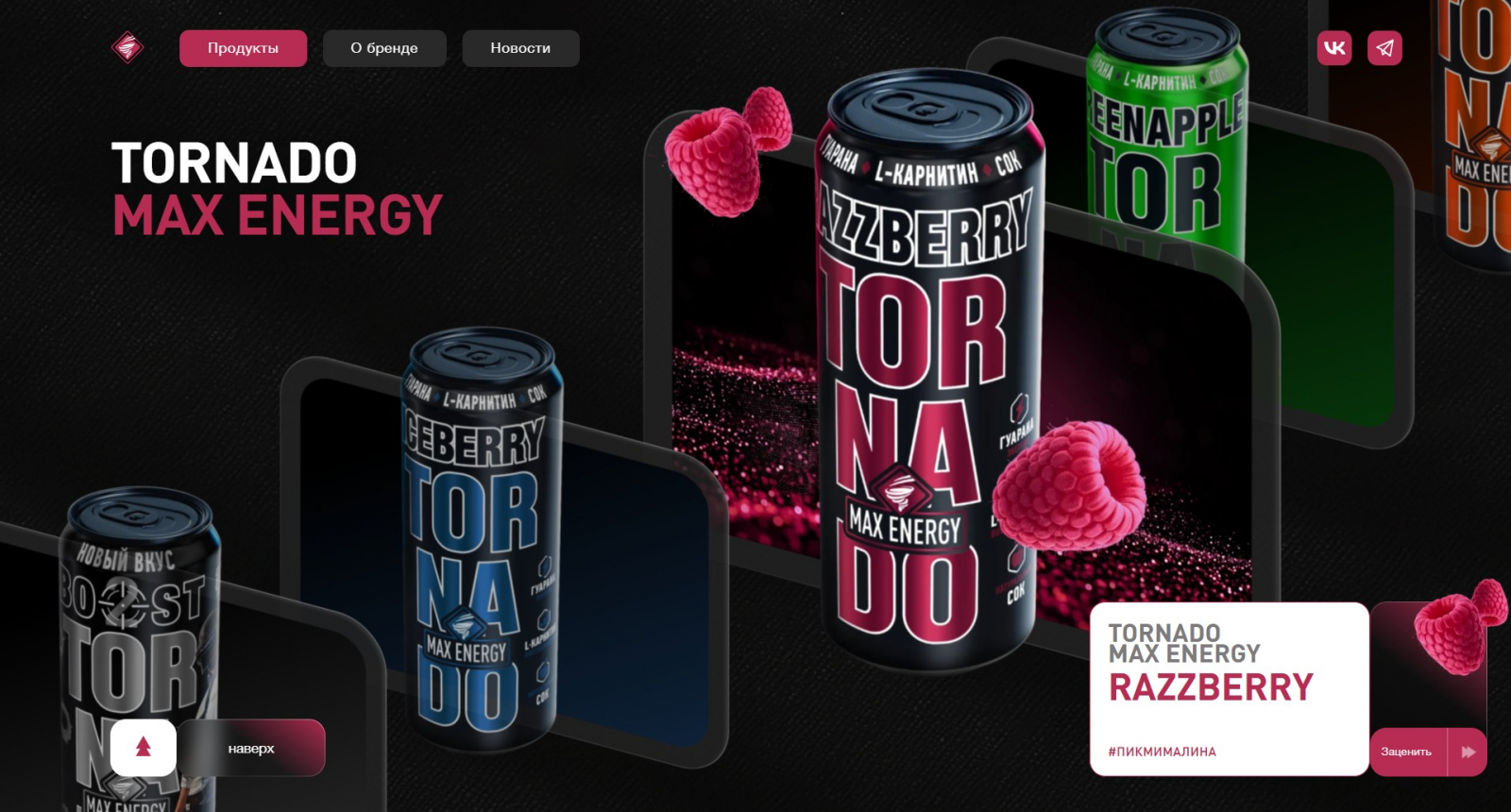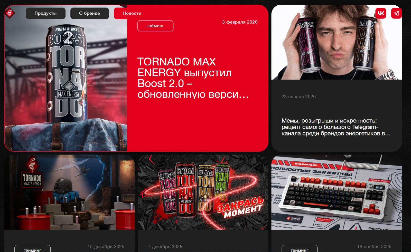 Бренд TORNADO MAX ENERGY завершил 2025 год обновлением продуктового сайта. Это не только технический апдейт и смена визуалов, а переосмысление цифрового присутствия: сайт стал новой точкой входа в мир бренда — более динамичной, визуально цельной и ориентированной на диалог с зумерами.