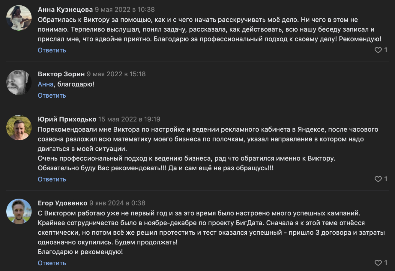 - Павел Мильц пишет, что Виктор запустил для него 7 рекламных кампаний, в некоторых нишах снизив стоимость заявки в разы.