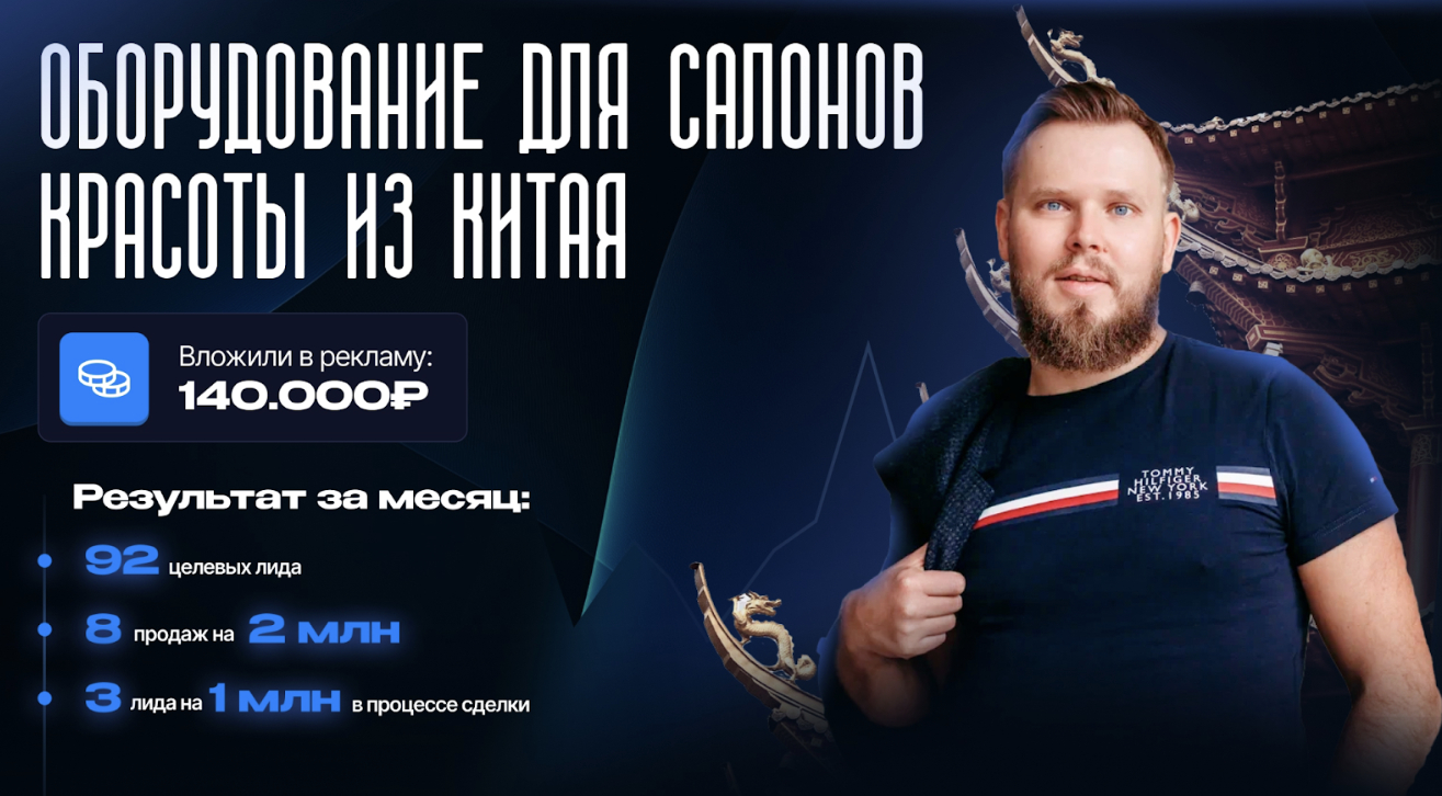В сегменте оборудования для салонов красоты: вложено 140 тыс. руб., результат — 92 целевых лида, 8 продаж на 2 млн и еще сделки в процессе. Для такого сегмента важным инструментом стал перехват конкурентов, лидов и точечный перехват трафика, что позволило быстро выйти на новый уровень продаж.
