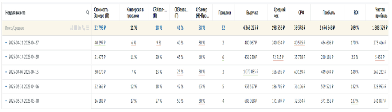На рисунке: пример боевого интерактивного еженедельного отчета по продвижению в нише «ПЛАСТИКОВЫЕ ОКНА». Видна только половина показателей, с которыми мы работаем.