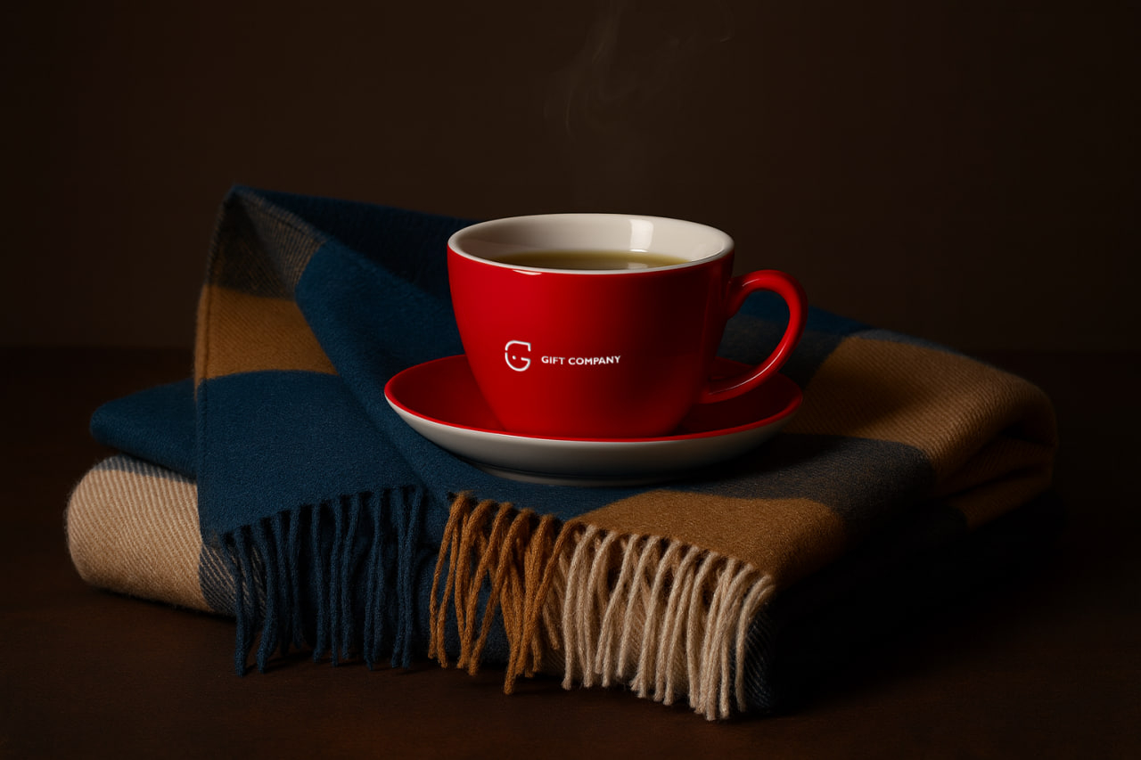 Как брендировать: вышивка на пледе или гравировка на чашке. Логотип лучше делать небольшим и с внутренней стороны.