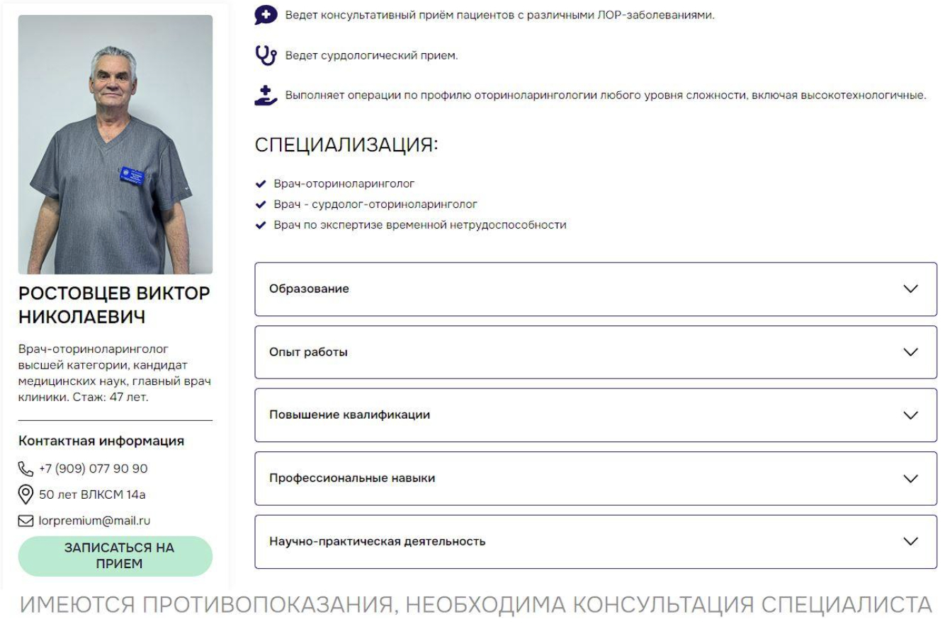 Семантика была кластеризована по услугам, симптомам, процедурам и геозапросам, с построением структуры «1 услуга — 1 посадочная страница». Карточки врачей содержат регалии, фото, отзывы, лицензии клиники и информацию о защите данных.