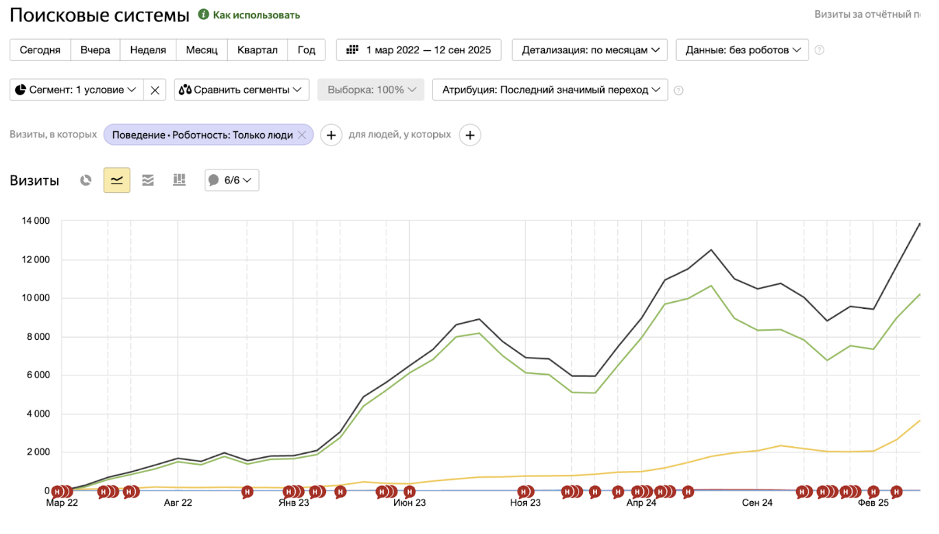 Важным этапом стала оптимизация и борьба с каннибализацией запросов, когда мы ювелирно настраивали релевантность страниц, например, снижали вес каталога ради главной по запросу «аренда спецтехники».