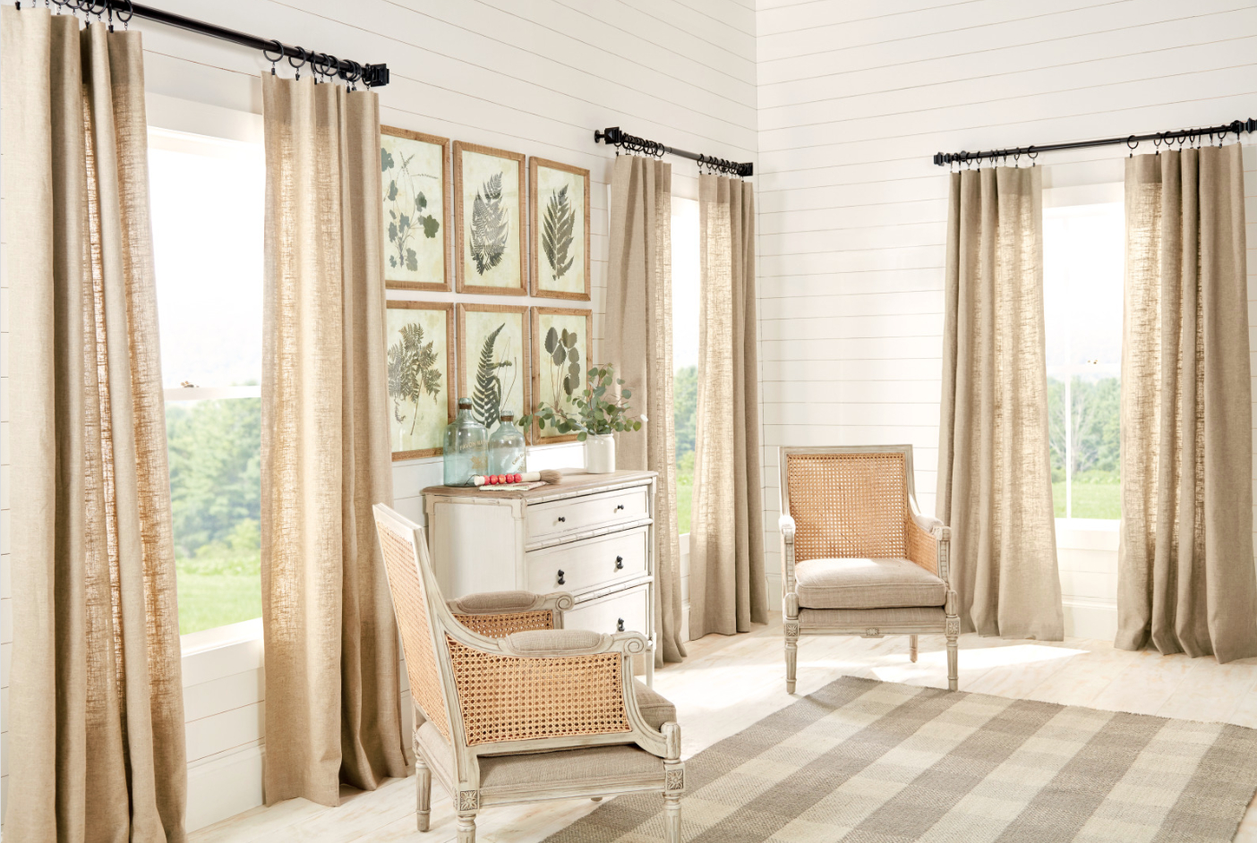 - Шторы из рогожки или букле в песочно-карамельных тонах – уют на максимум.