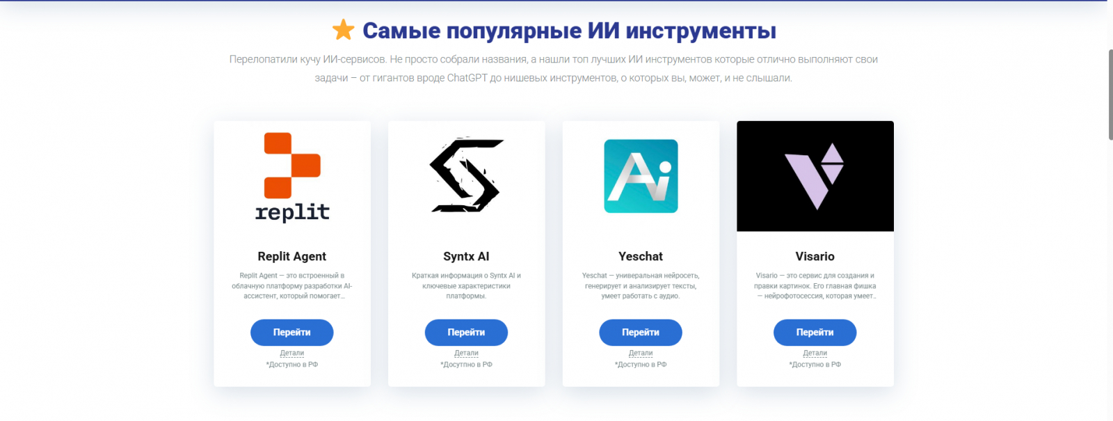 Первое, что бросается в глаза при активном использовании — не всегда легко понять, по каким критериям инструменты попадают в топ "Самые популярные". Видно, что там есть и Replit Agent, и Yeschat, и Visario, но непонятно — это популярность по количеству переходов с сайта, по мнению редакции, по отзывам пользователей? Хотелось бы больше прозрачности. Может, стоит добавить пояснение или даже несколько категорий: "Топ по выбору редакции", "Самые используемые в России", "Новинки месяца" — что-то в этом духе.