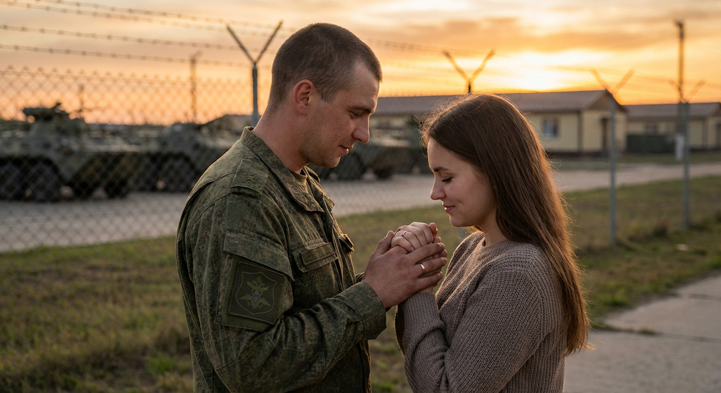 Russian soldier in olive field uniform gently holding hands with his wife, standing near military base fence during sunset, warm orange lighting, emotional expressions, shallow depth of field, cinematic composition, photorealistic details, wedding rings visible, professional portrait photography