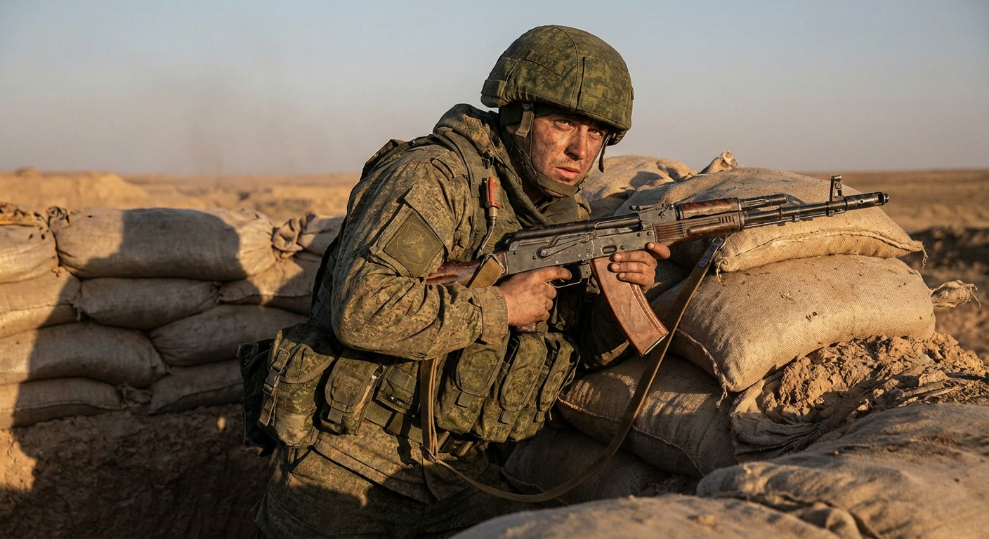 Russian military serviceman in field uniform taking cover behind sandbags, holding rifle, dusty environment, late afternoon sunlight, serious facial expression, detailed tactical equipment, authentic military scene, photorealistic textures, war correspondent photography style, high detail
