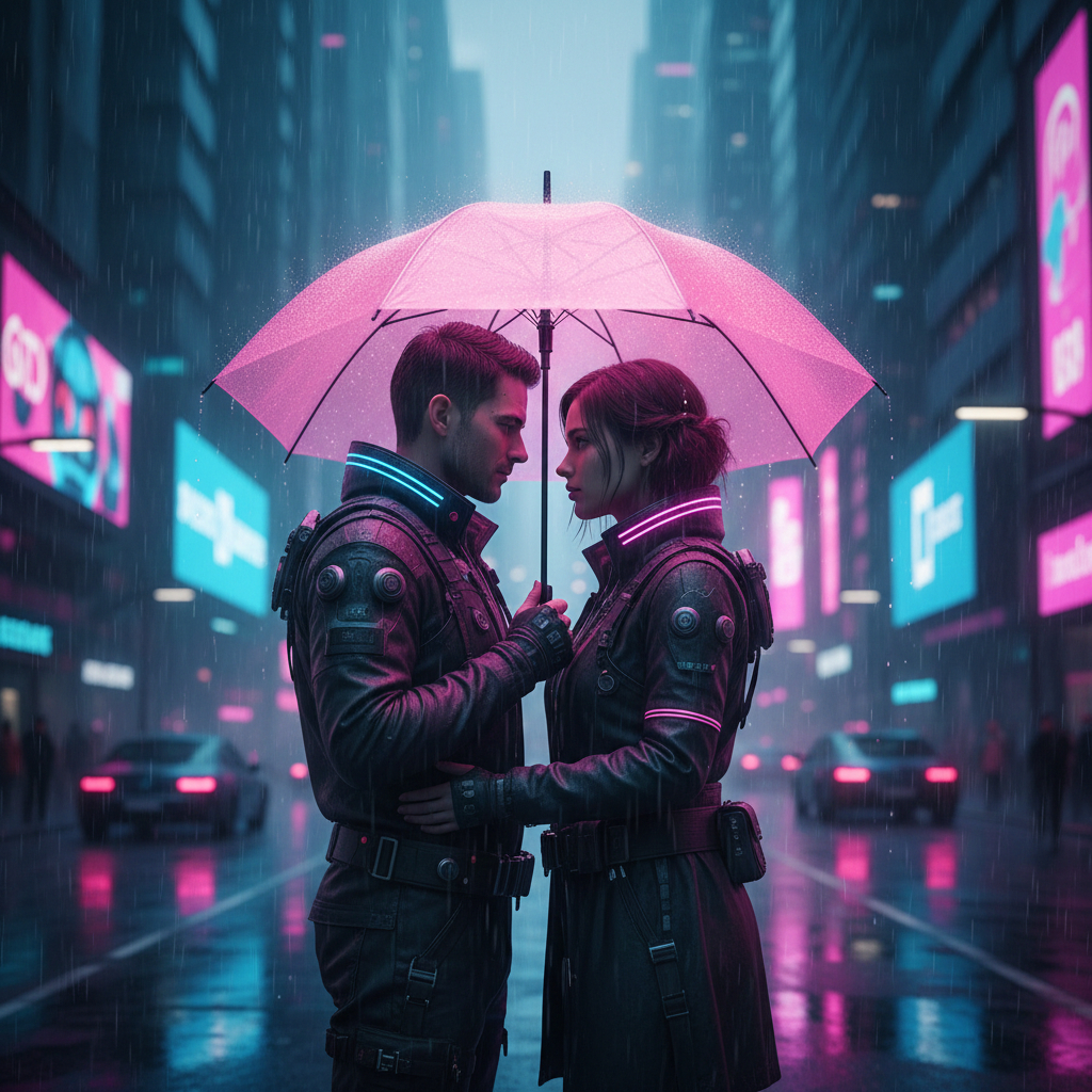 Futuristic couple under a glowing pink umbrella, rainy street of Neo-Tokyo, neon blue reflections in puddles, cinematic lighting, volumetric fog, techwear aesthetic, sharp details, shot on Arri Alexa.