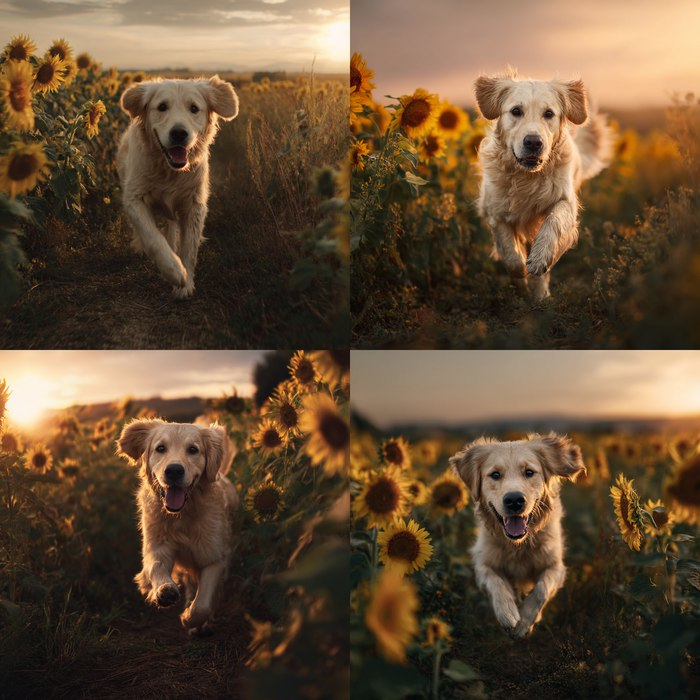 Cinematic shot of a golden retriever running through a field of sunflowers at sunset, camera slowly panning right, warm golden hour lighting, shallow depth of field, photorealistic style