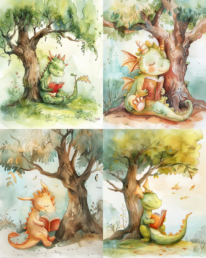 Whimsical children's book illustration, cute dragon character reading a book under a tree, watercolor style, soft pastel colors, magical atmosphere, detailed textures, storybook art, warm and inviting --v 6 --ar 4:5 --q 2