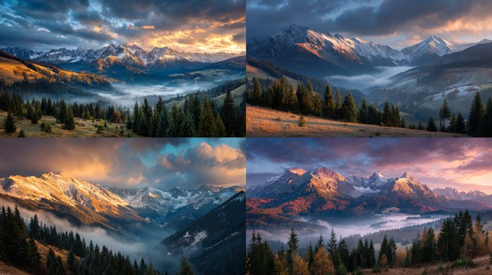 Breathtaking mountain landscape at sunrise, misty valleys below, golden light hitting snow-capped peaks, dramatic clouds, pine forest in foreground, ultra wide angle, nature photography, vivid colors, National Geographic style --v 7 --ar 16:9 --q 2