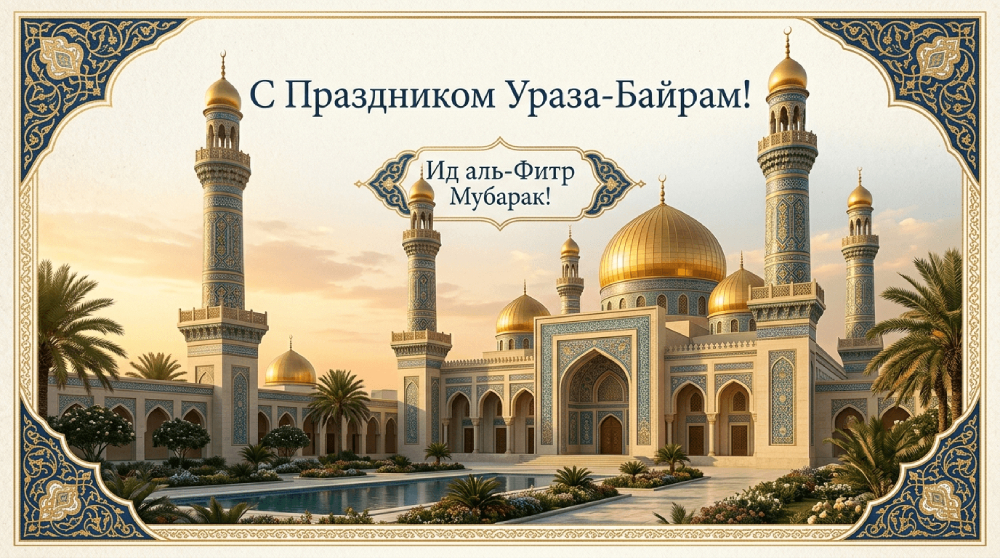 Классическая композиция с мечетью, золотыми куполами и традиционными исламскими узорами. Текст на русском: "С Ураза-Байрам!" Идеально подходит для официальных поздравлений коллегам и партнерам.