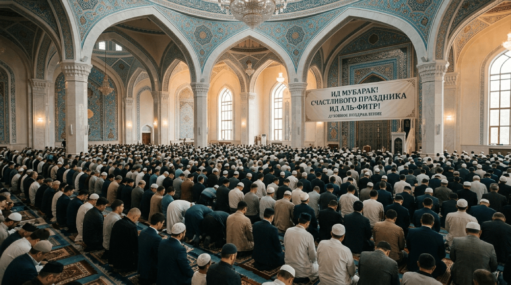 Торжественная сцена коллективной молитвы. Текст на русском: "Ид Мубарак! С Ураза-Байрам!" Подчеркивает духовную составляющую праздника и подходит для официальных поздравлений от организаций.