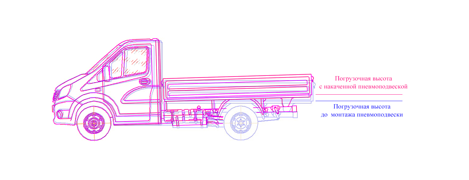 Пневмоподвеска действительно помогает, но нельзя забывать про индивидуальность каждого автомобиля. К примеру, возьмем самый популярный грузовой авто – Газель Некст с промтоварной надстройкой. Замерив расстояние между мостом и лонжероном рамы, вероятнее всего получим 16-18 см. А зная, что подушка 180Д1 при давлении 8 бар способна вытянуться на 24 см., мы можем предположить, что кузов над заднем мостом поднимется на 6-8 см. На краю заднего свеса высота изменится немного больше.