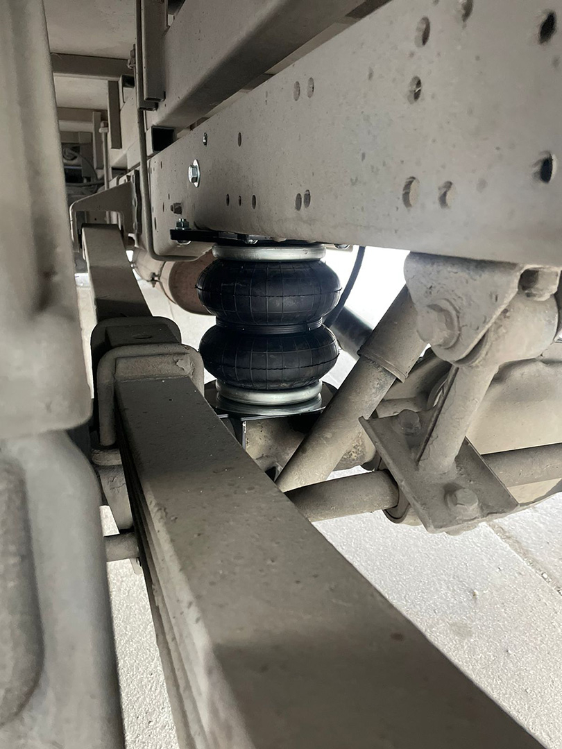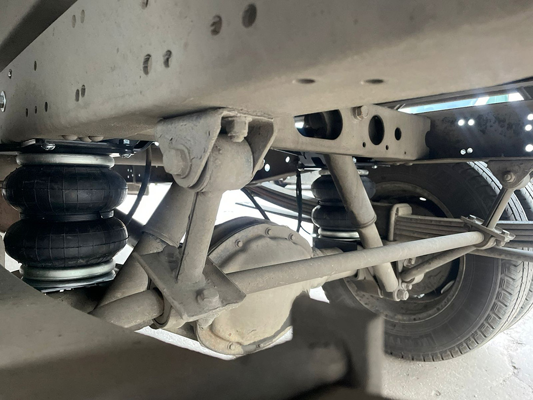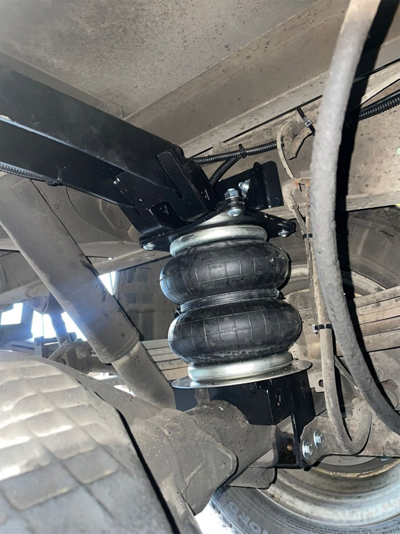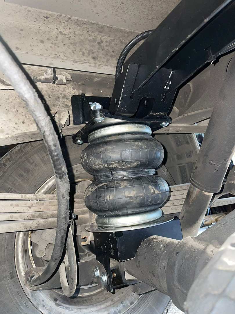 Пневмоподвеска незначительно подняла кузов авто, но учитывая конструктив штатной подвески, альтернативных вариантов с большими подушками просто не было. Просадка авто при загрузке вилочным погрузчиком электророхлей или другой тяжелой техникой минимизирована.
