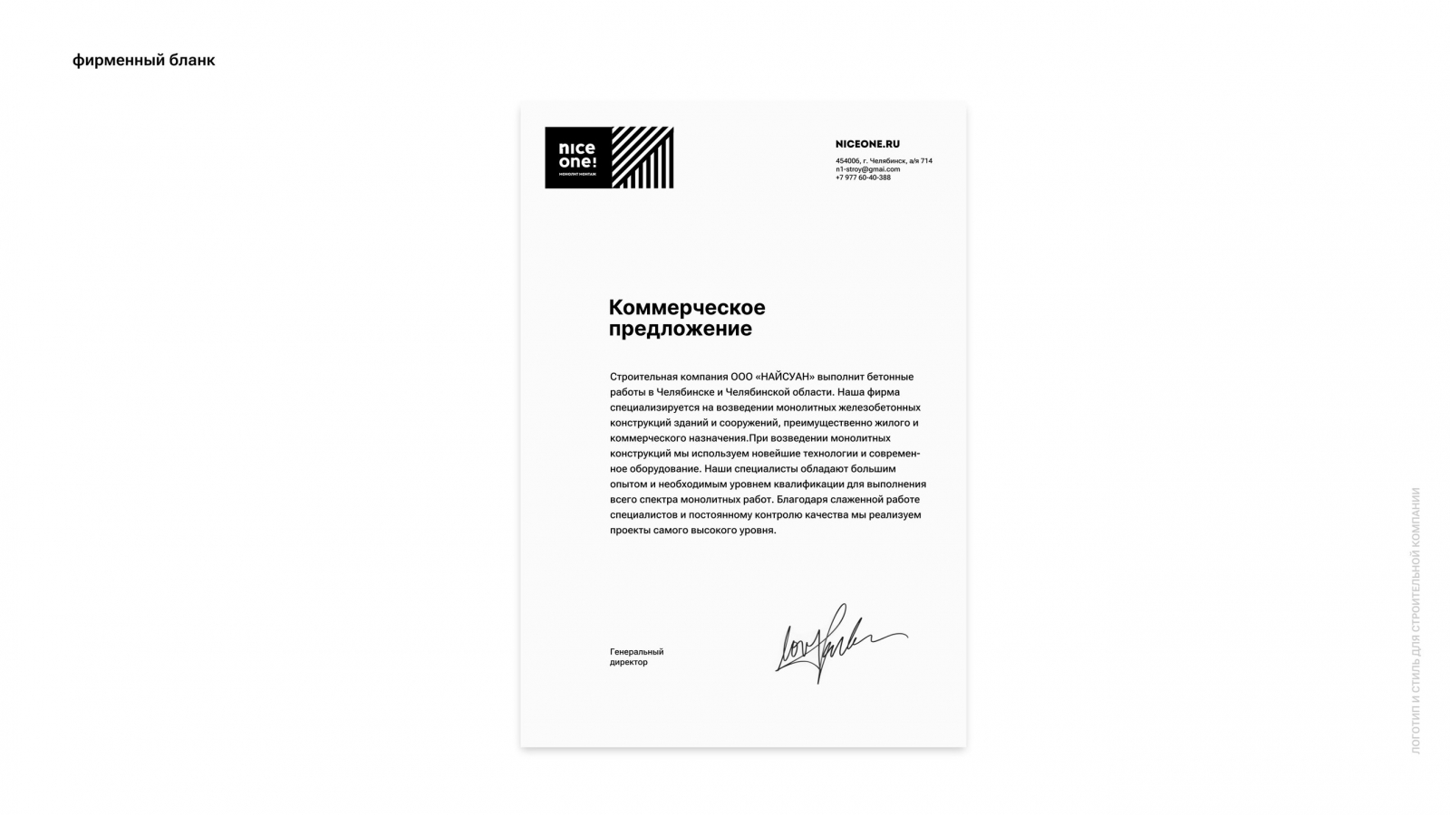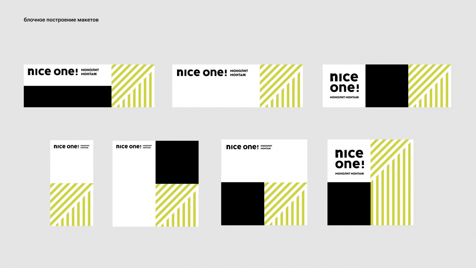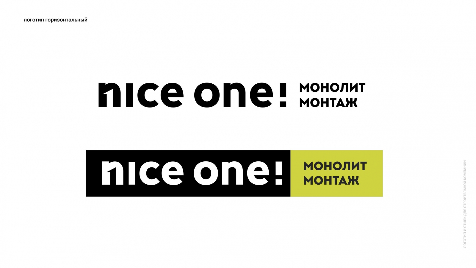 Nice One — строительная компания, специализирующаяся на монолитных железобетонных конструкциях для жилых и коммерческих объектов в Челябинске и Челябинской области. Клиенты — девелоперы, генподрядчики, инженеры, прорабы и частные заказчики, для которых первичны надёжность, технологичность и скорость выполнения работ. Nice One нуждалась в айдентике, которая: чётко считывается в строительной категории; вызывает доверие у B2B-аудитории; эмоционально выделяется на фоне однотипных и визуально устаревших брендов; работает на любом носителе — от каски и спецодежды до digital.