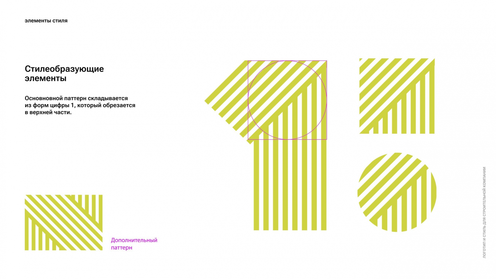 Графический паттерн построен на форме цифры «1» — символе лидерства и движения вперёд. Мы обрезали её верхнюю часть, создав ритмичный модуль, который лег в основу фона, сетки и фирменных носителей. Паттерн усиливает ассоциацию с конструкциями и каркасами, а также визуально поддерживает само название Nice One.