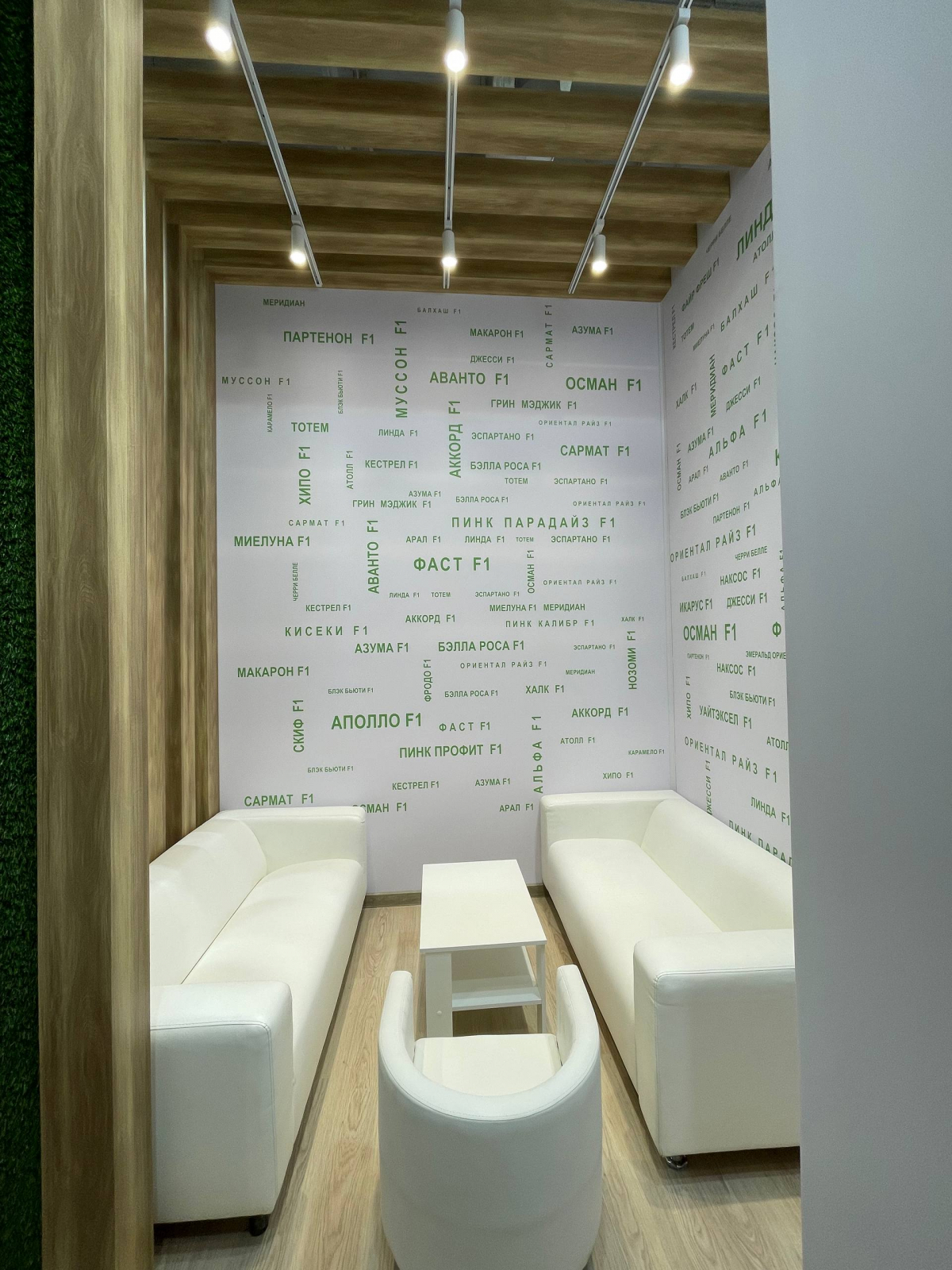 Центральная часть стенда оборудована переговорной зоной с белыми дизайнерскими креслами на деревянных ножках и круглыми столами, где представители «Престиж Агро» могли проводить личные консультации и деловые встречи. Отдельно была организована приватная переговорная с мягкими диванами для конфиденциальных переговоров.