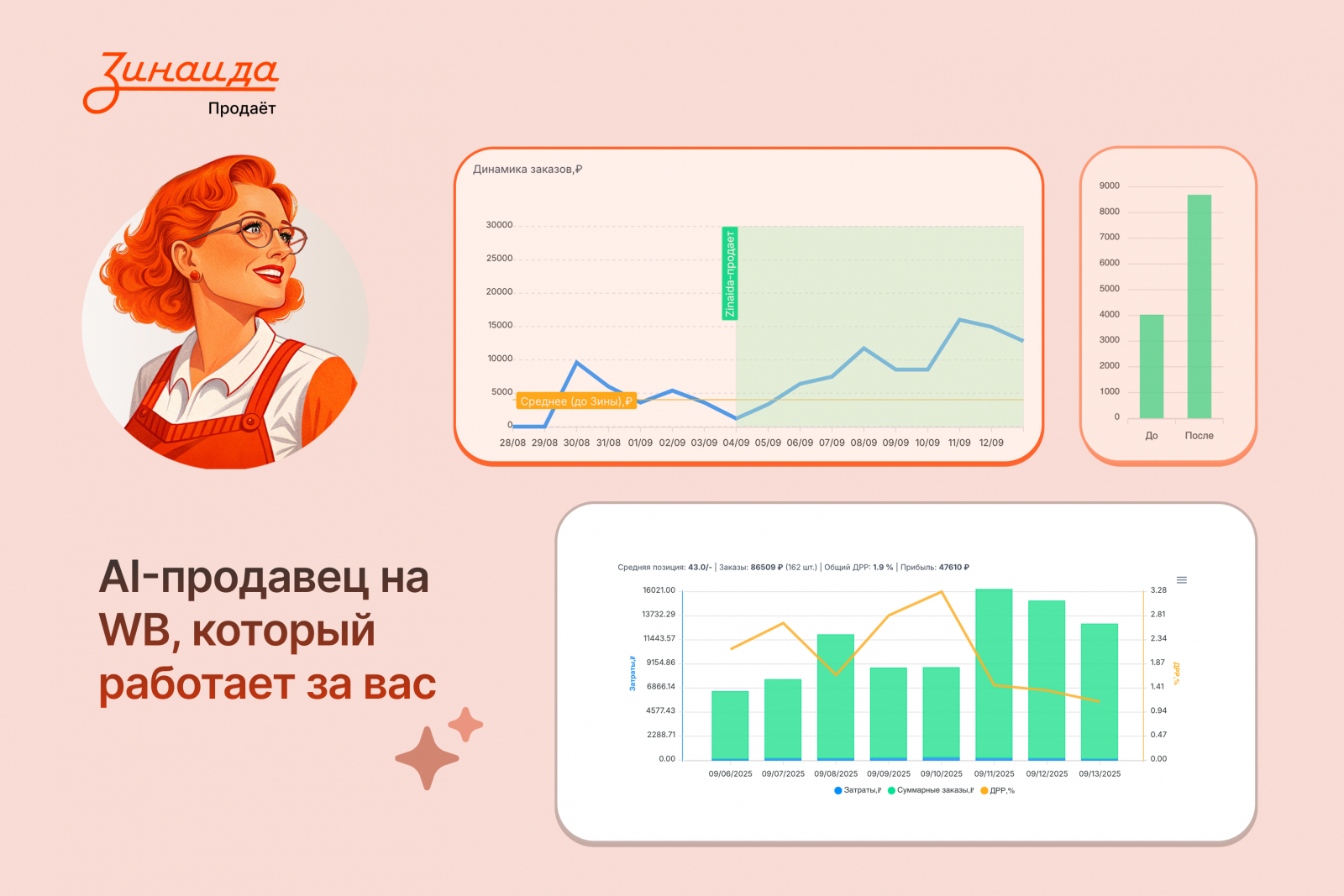 «Зинаида Продаёт» — первый в России AI-сервис для автоматического управления рекламой на Wildberries. Разработанный командой выходцев из ведущих российских IT-компаний, сервис использует передовые технологии искусственного интеллекта и машинного обучения для увеличения валовой маржи продавцов. Миссия проекта — сделать сложные рекламные технологии доступными для каждого предпринимателя.
