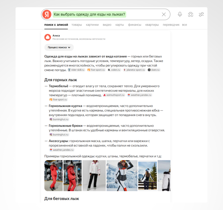 Например, вы спрашиваете: «Как выбрать одежду для езды на лыжах?» — и вместо того чтобы искать статьи, переходить по сайтам, вы сразу видите сравнительную таблицу: бренды, характеристики, советы — всё на одной странице.
