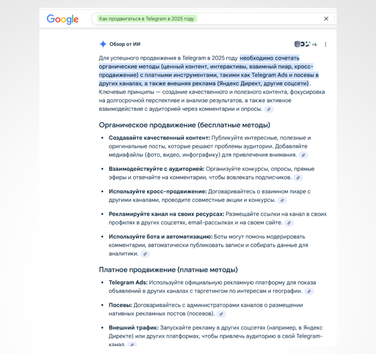 Или запрос вроде: «Как продвигаться в Telegram в 2025 году» — и перед вами уже готовая стратегия: охваты, форматы, что писать в постах.