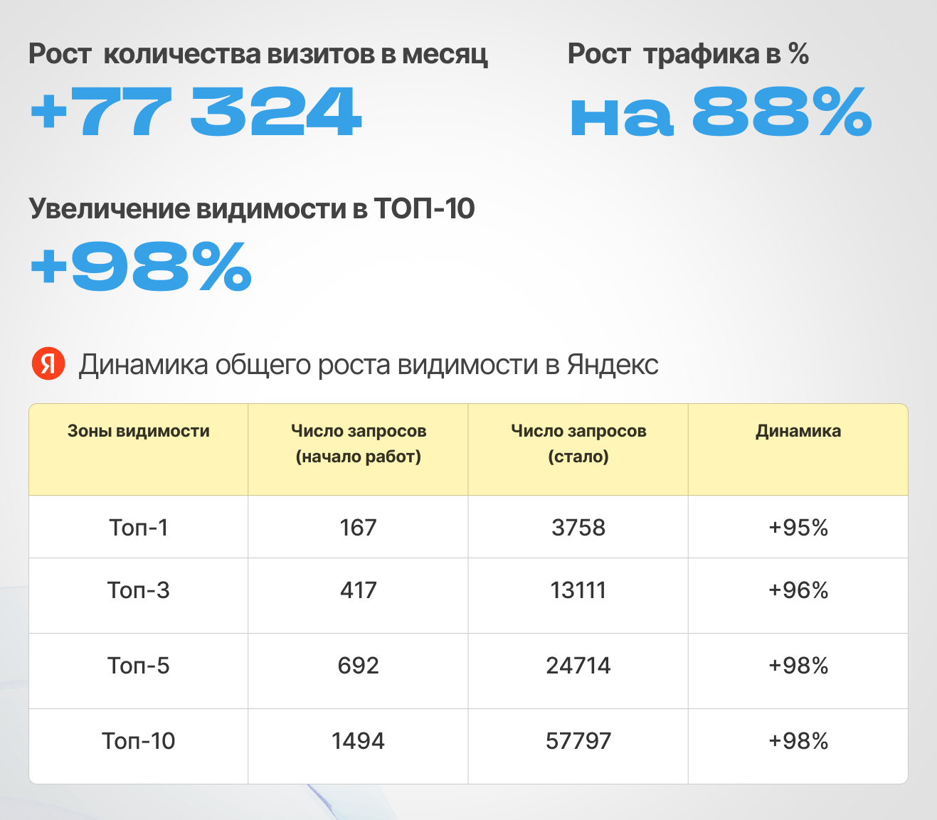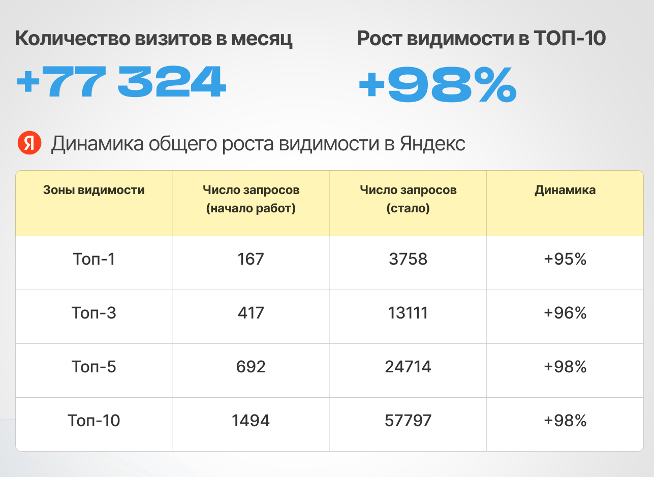 Эти изменения не только улучшили структуру сайта, но и сделали его более удобным для пользователей и понятным для поисковых систем, что привело к росту позиций и увеличению органического трафика.
