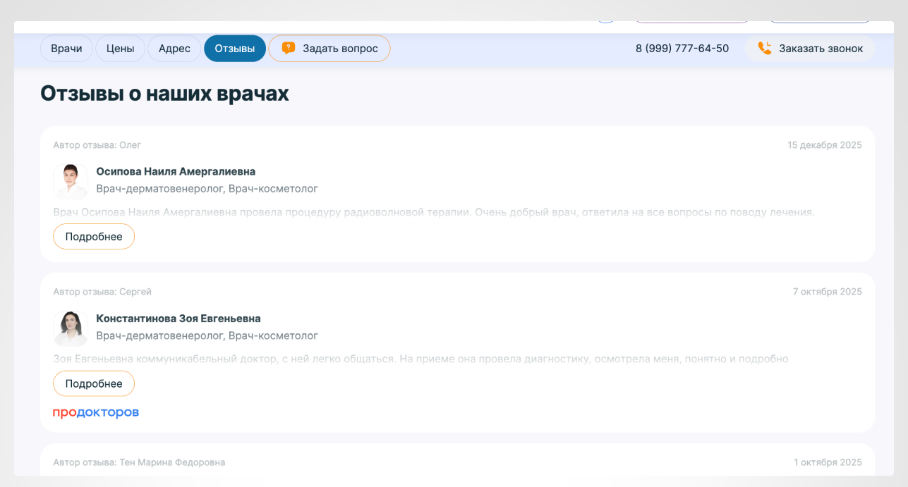 Мы добавили вывод отзывов на страницах услуг и профилях врачей, что укрепляет доверие и демонстрирует открытость клиники. Мы также оптимизировали разметку отзывов для поисковых систем.