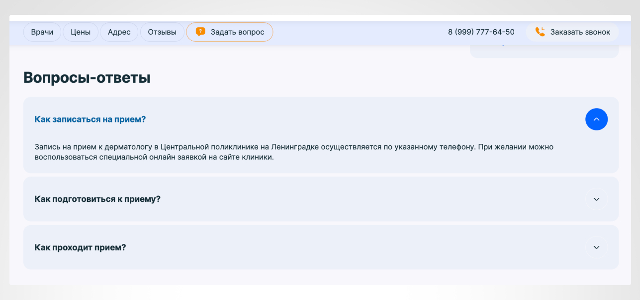 Мы создали раздел FAQ на страницах услуг и профилях врачей, чтобы помочь пользователям найти ответы на самые распространенные вопросы, улучшая вовлеченность и удовлетворенность.