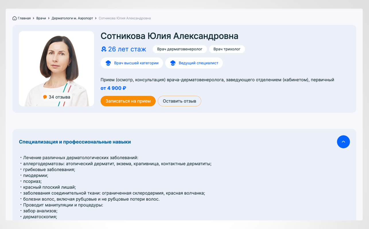 В карточках врачей добавили информацию о квалификации, профессиональных достижениях и участии в научных исследованиях, что повышает доверие к специалистам и клинике в целом.