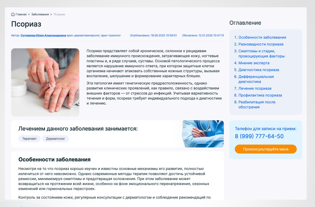 Мы готовили SEO-тексты, которые детально описывают услуги, включая методы лечения, показания и противопоказания, а также ссылки на актуальные научные исследования. Это повышает доверие пользователей и релевантность страницы для поисковых систем.