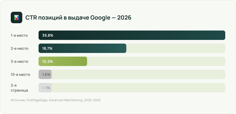 Три из четырёх пользователей кликают по одному из первых трёх результатов. Всё ниже пятой позиции — крохи трафика.
