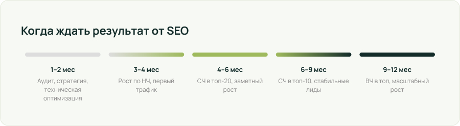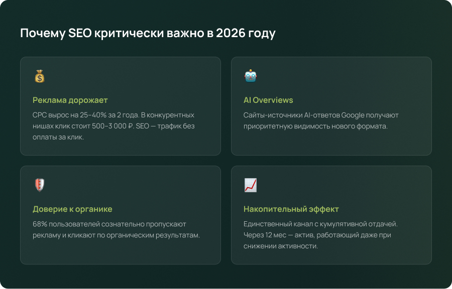 SEO — единственный канал с кумулятивной отдачей. Каждый месяц наращивает авторитет, контент, ссылочную массу. Через 12 месяцев — актив, который работает даже при снижении активности.