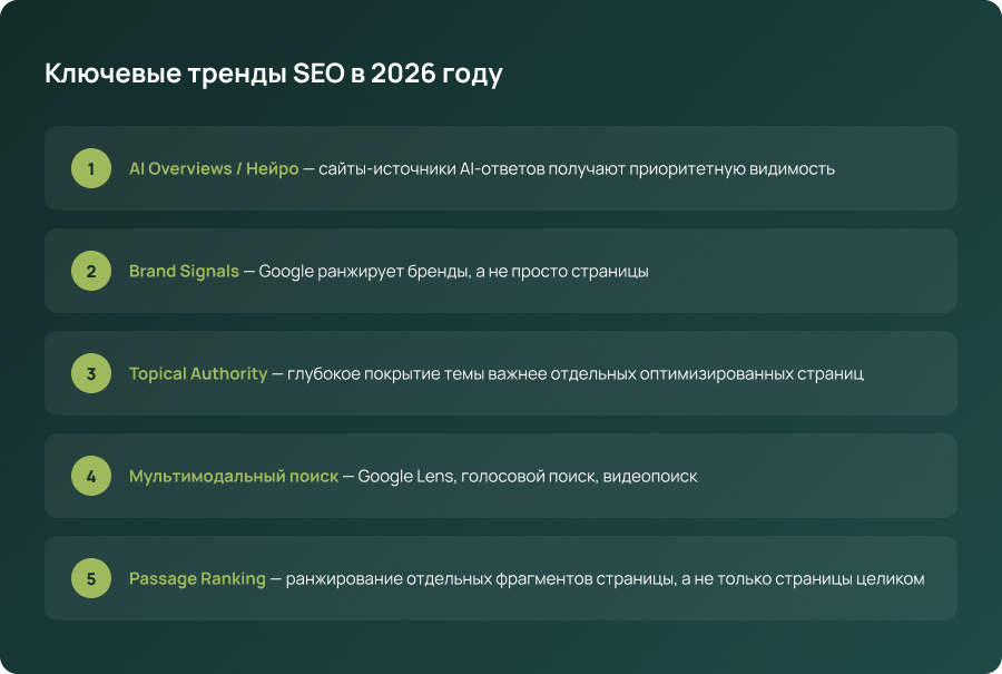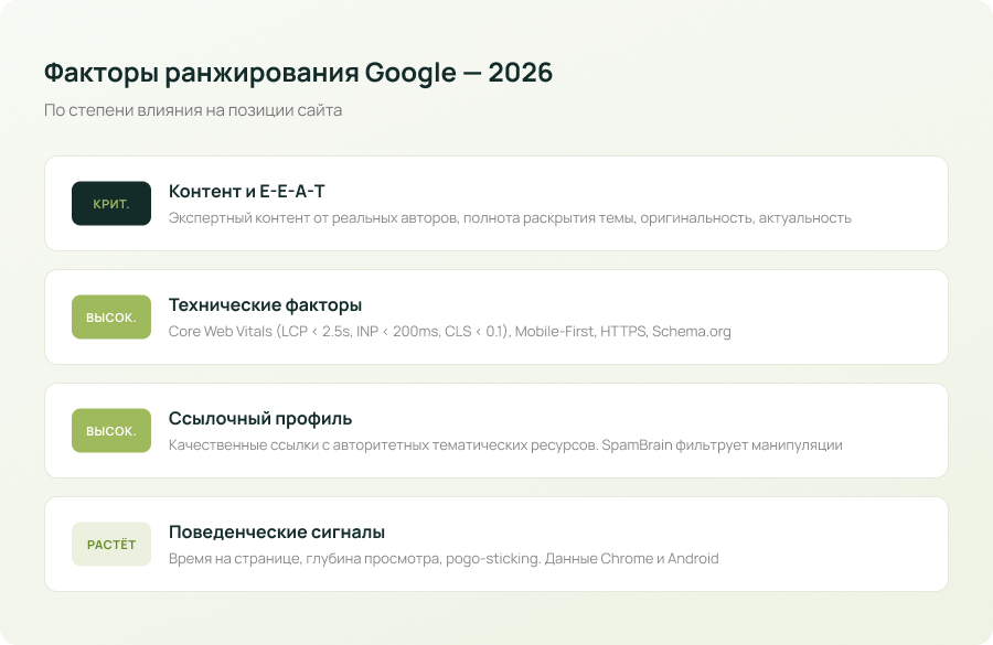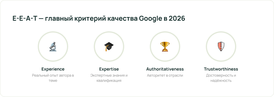 E-E-A-T (Experience, Expertise, Authoritativeness, Trustworthiness) — центральная концепция качества. В 2026 году Google отдаёт приоритет контенту от реальных экспертов с подтверждённым опытом. Авторство, биография, квалификация — обязательны. AI-контент без экспертной добавленной ценности теряет позиции.