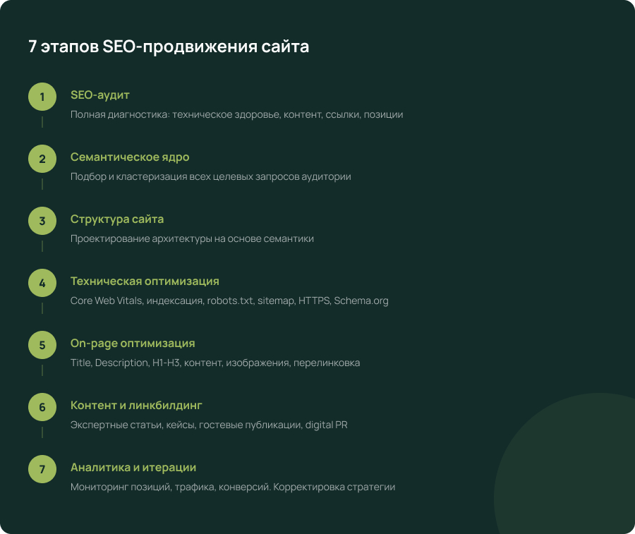Ежемесячный мониторинг позиций, трафика, конверсий. Корректировка стратегии на основе данных. Инструменты: GSC, Вебмастер, GA4, Метрика, Ahrefs.
