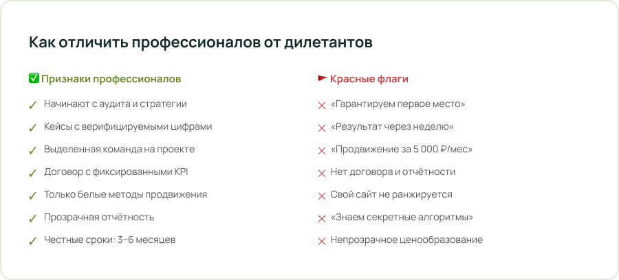 Если обещают «топ-1 за месяц» — это обман или чёрные методы, которые закончатся санкциями.
