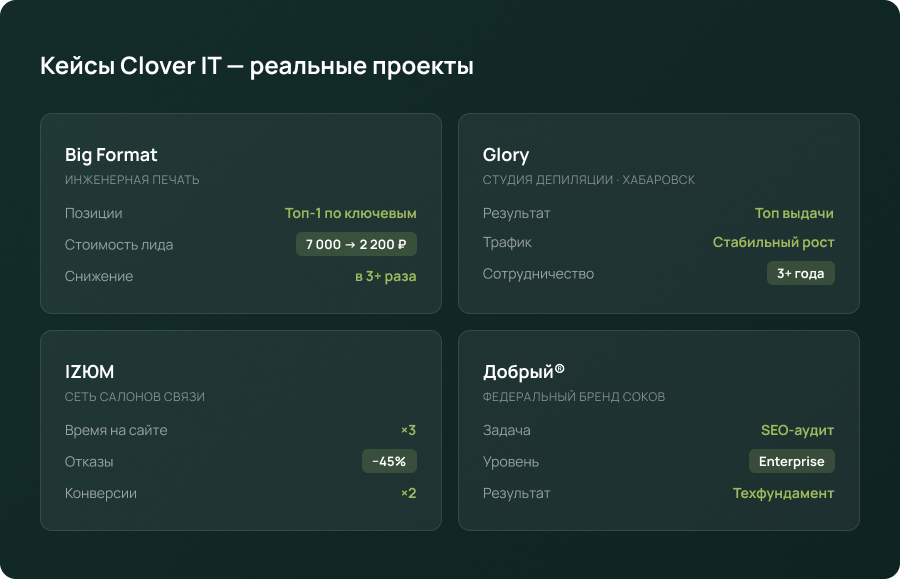 Результат: корректный технический фундамент для продвижения. Кейс уровня доверия — федеральные бренды обращаются в Clover IT за экспертизой.
