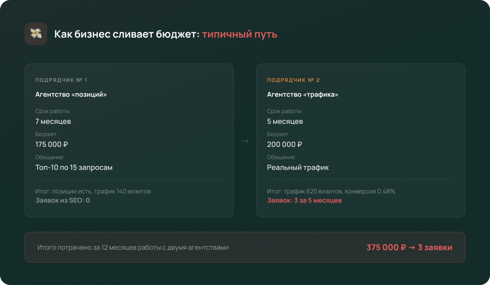 После двух подрядчиков Алексей потратил минимум 375 000 ₽ и получил три заявки. Давайте без иллюзий разберём, почему.