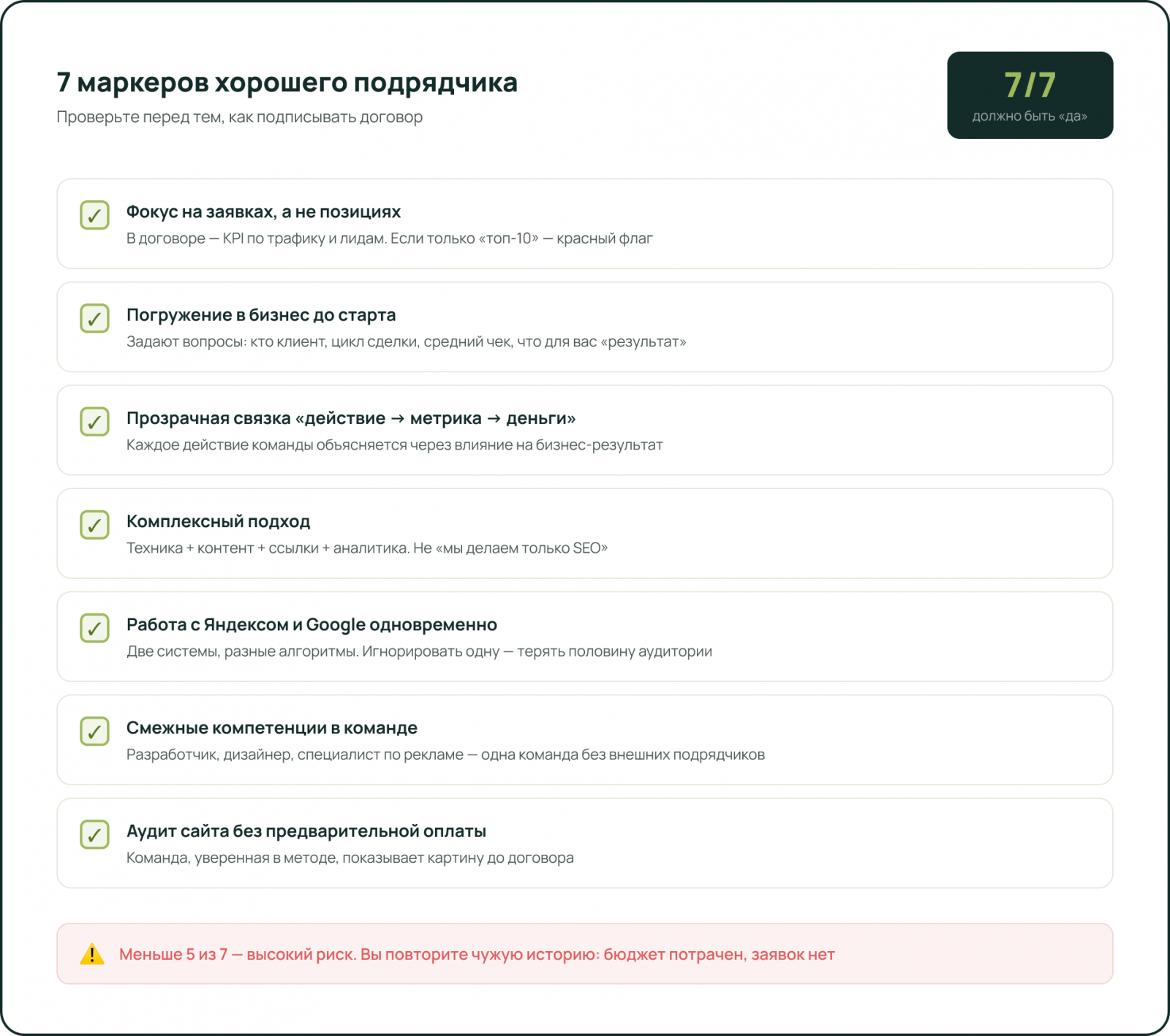 ✅ Фокус на заявках и конверсиях, а не на позициях — если в договоре написано «топ-10 по 20 запросам», но ничего про трафик и лиды — красный флаг