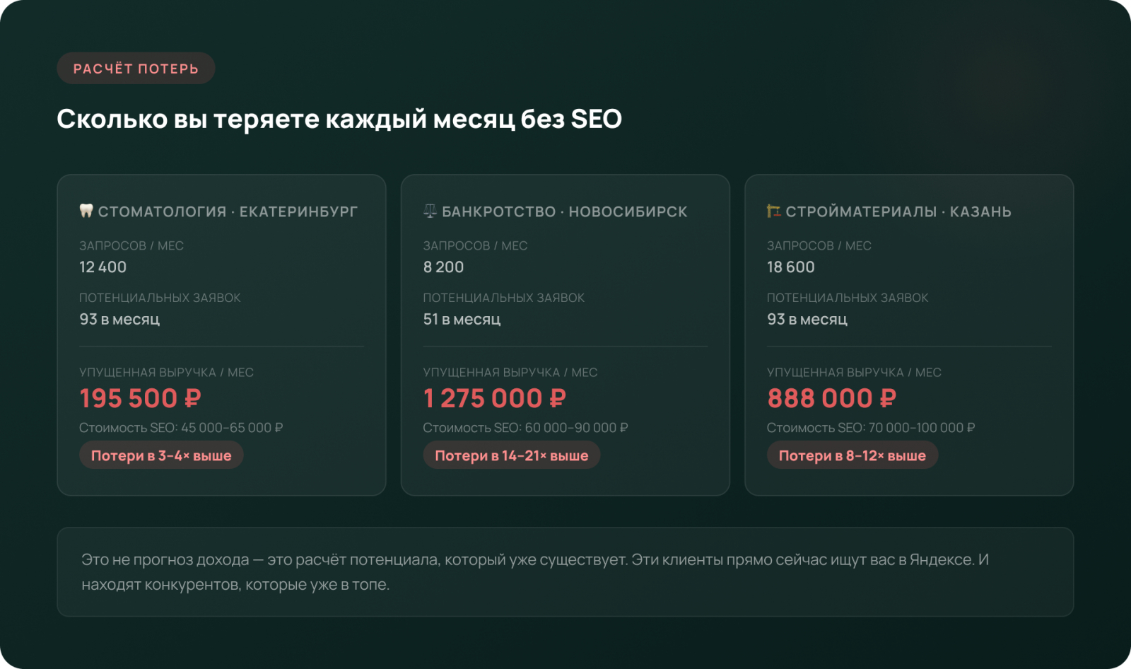 Важная оговорка: это расчёт упущенного потенциала, а не гарантия дохода. Топ-3 — это результат системной работы, не моментального действия. Но эти клиенты существуют прямо сейчас. И пока ваш сайт не в топе, они уходят к конкурентам.