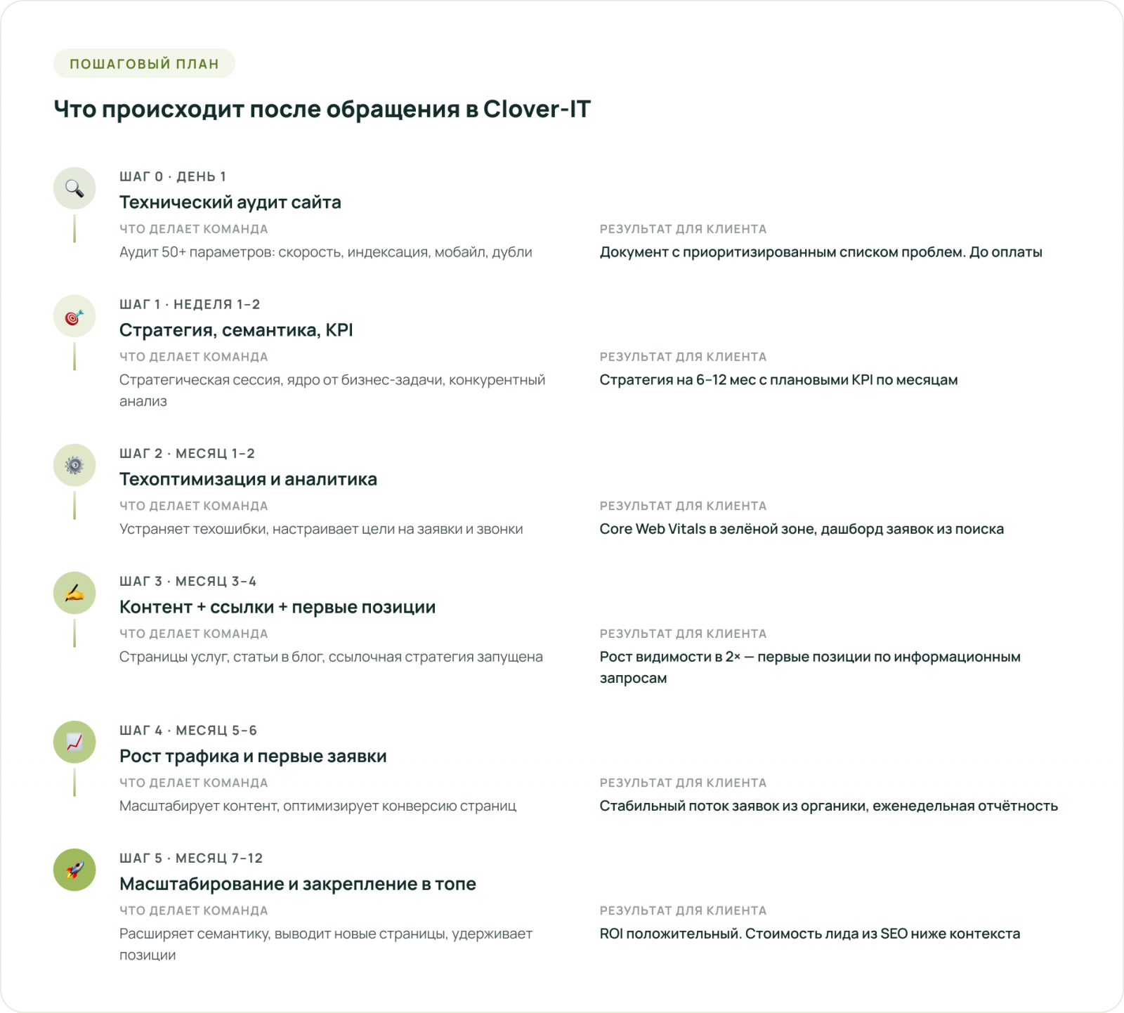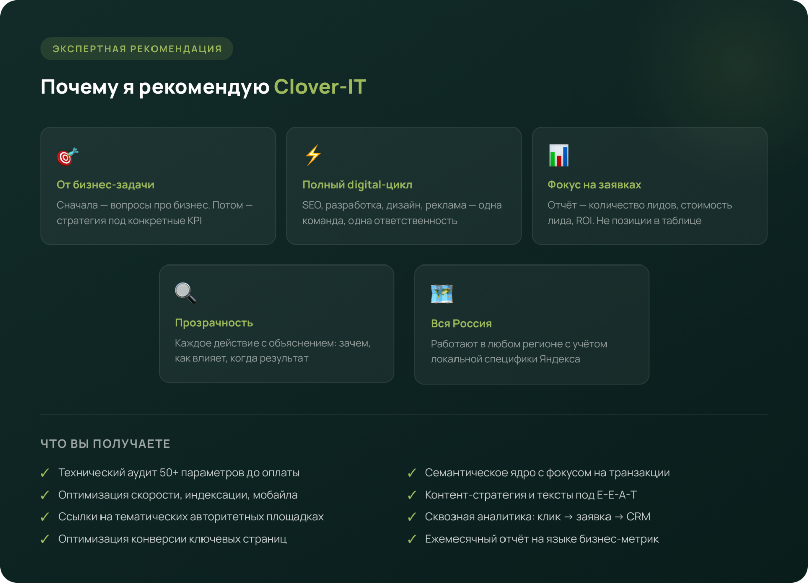 📈 Хотите понять, какой из шести компонентов блокирует рост вашего сайта?Clover-IT проведёт технический аудит и покажет конкретные точки потери трафика — до подписания договора.