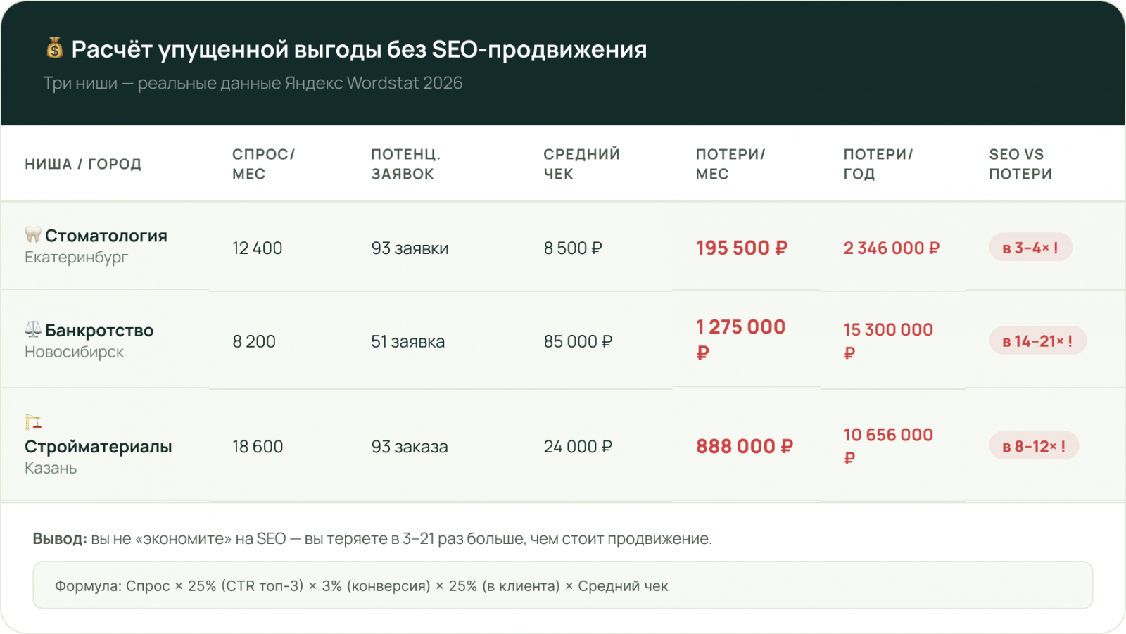 Упущенная выручка = Поисковый спрос × CTR топ-3 (25%) × Конверсия сайта (3%) × Конверсия в клиента (25%) × Средний чек
