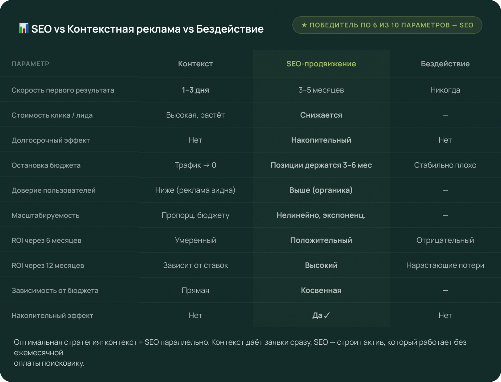 Вопрос «что лучше — SEO или контекст» — неправильный. Правильный вопрос: как эти инструменты работают вместе и что происходит, если не делать ничего.