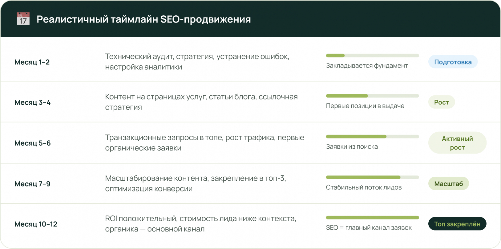 SEO — это марафон, не спринт. Первые значимые результаты — через 3–5 месяцев. Если нужен быстрый старт — начинайте с контекста параллельно.