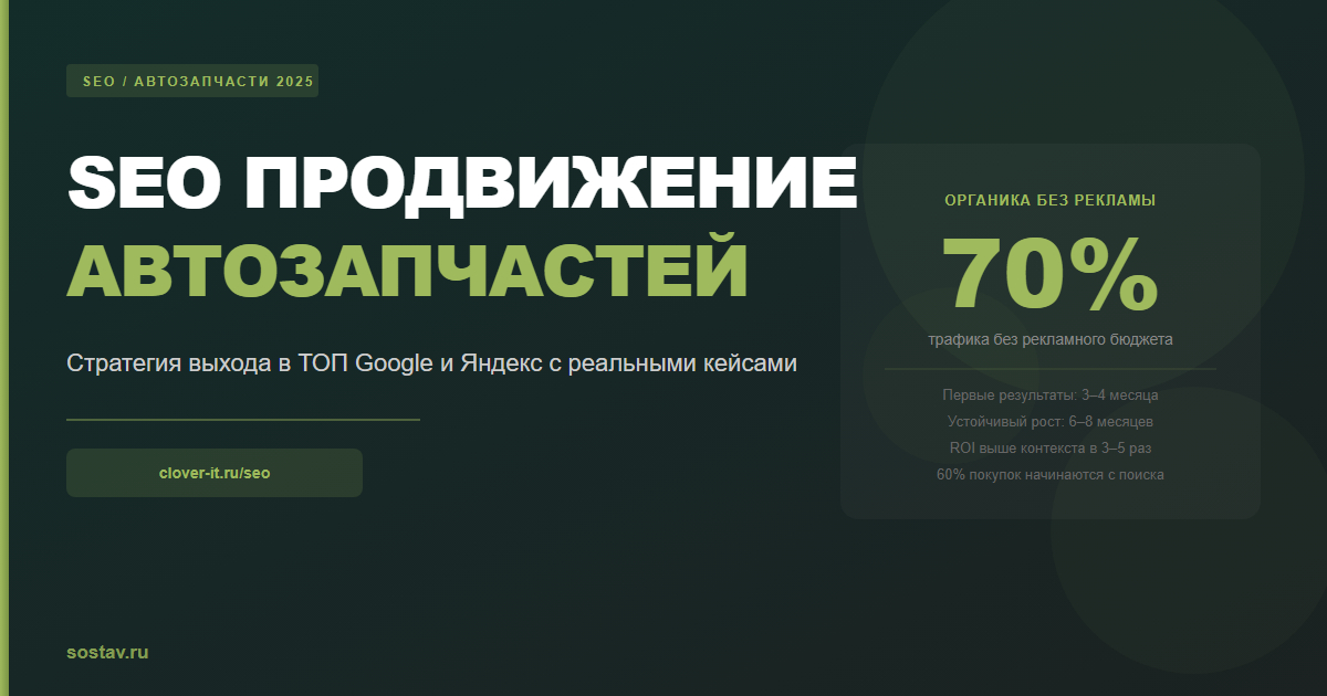 SEO-продвижение магазина автозапчастей — системная стратегия, которая при правильном подходе превращает органический поиск в главный канал продаж. Органический трафик работает 24/7, не останавливается при отключении бюджета и снижает стоимость привлечения клиента с каждым месяцем работы. Если вы хотите выйти в топ Google и Яндекса и получить стабильный поток клиентов без зависимости от рекламных аукционов — закажите бесплатный аудит и стратегию в агентстве Clover IT. Первый шаг — анализ вашего сайта и точек роста без обязательств.