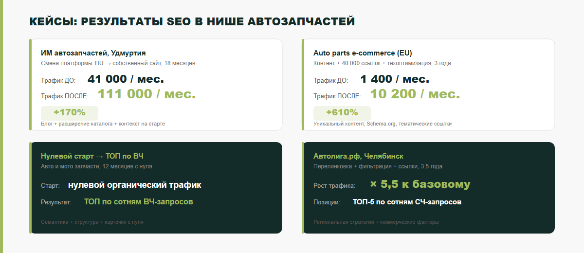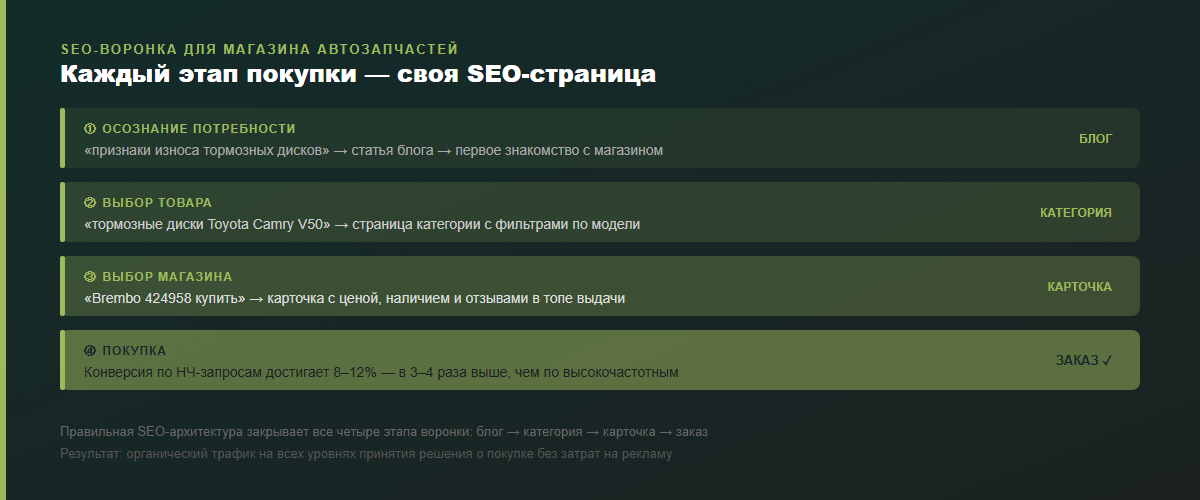 Ещё одна особенность ниши: семантическое ядро магазина автозапчастей может насчитывать от 50 000 до 500 000 запросов — каждая марка × каждая модель × каждое поколение × каждая запчасть. Это огромное количество точек входа из поиска, которые при правильной архитектуре сайта генерируют стабильный поток целевых посетителей круглосуточно без единого рубля на рекламу.