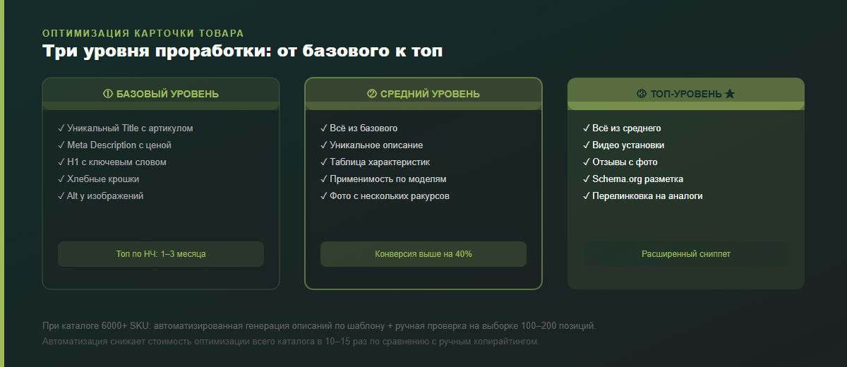 При каталоге 6 000+ SKU писать описания вручную нереально. Решение — автоматизированная генерация текстов на основе характеристик из базы данных: скрипт подставляет параметры запчасти в шаблон и получает уникальный информативный текст для каждой карточки. После ручной проверки на выборке (100–200 позиций) результат масштабируется на весь каталог без раздутого бюджета на копирайтинг.