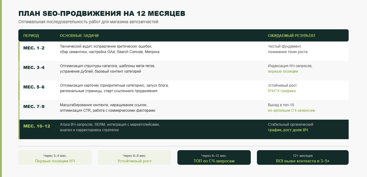 SEO — марафон, а не спринт. Чёткий план работ с приоритетами позволяет не распылять бюджет и получить предсказуемый результат. Ниже — оптимальная последовательность для магазина автозапчастей любого масштаба: от небольшого регионального до крупного федерального игрока.